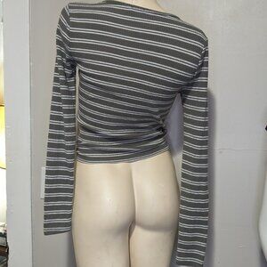 Very soft striped sweater. Fun ruching ties in the front. Good used condition.