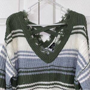 Rue21 Striped Distressed Green & White Sweater(Size Small)