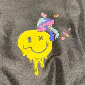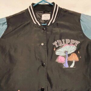 Rue21 Varsity Bomber Jacket Men's Medium Black Teal Trippy Wild Life Graphic EUC