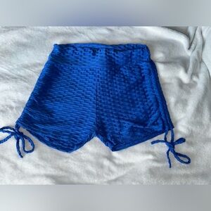 Vibrant blue ribbed fabric, has drawstrings on sides to pull sides up more or down, butt lifting back size medium