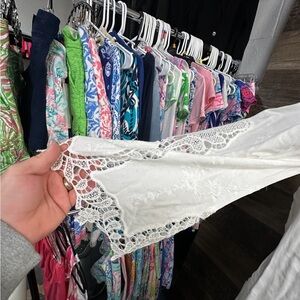 This casual white sundress from Rue21 features a charming square neckline and flutter 3/4 sleeves, perfect for resort wear. The dress boasts a light, airy fabric with a delicate lace overlay, offering a fresh and feminine look ideal for warm weather outings.