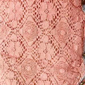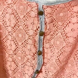 Rue21 brand. Pink coral floral lace / crochet crop top with faded blue denim edging and bronze buttons. Cutout diamond detailing. Spaghetti straps are adjustable. Has a built-in shelf bra. In preloved condition, no visible defects (see photos for condition, if applicable); as with any preowned clothes, you should wash before wearing the first time. Made of 100% nylon. From a pet friendly home.