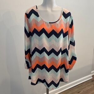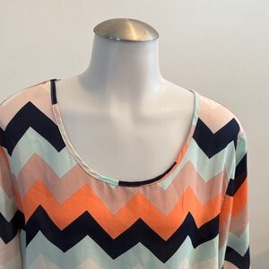 Stylish women's top featuring a vibrant chevron pattern in orange, navy, and cream. Perfect for adding a pop of color to your wardrobe.