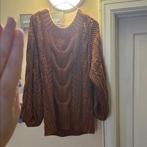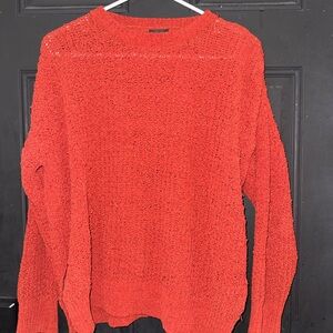 Neon - and I’m talking NEON - orange sweater. This sweater has a loose knit to it - you would want to wear something underneath. Not too light, not too chunky. Great statement piece! 🧡