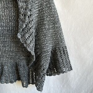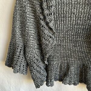 Rue21 charcoal gray heather open front shrug sweater, size M. Good preowned condition. 100% cotton. Half sleeves with bell shape at bottom. Open weave along 3.5” of entire outer edge (collar, front, bottom, sleeve bottoms). Great for layering!