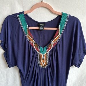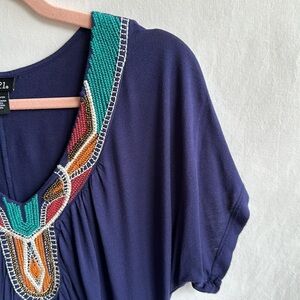 Rue21 navy boho V-neck top with embroidery and beading, size L