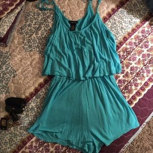 This romper is super cute and comfy! Electrifying teal blue in color and it is 100% RAYON. Only worn a few times and it is in perfect condition