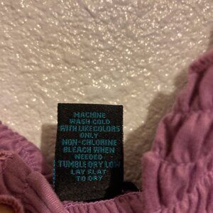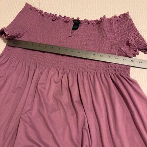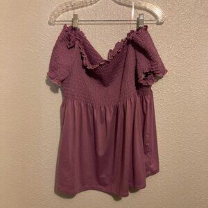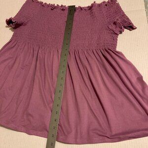 Rue purple short sleeve blouse, off the shoulder, ruffle trim, peplum hem, smocked, V-neck