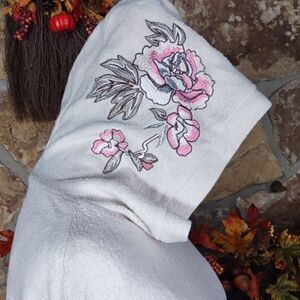 Pink and Nuetral Floral Embroidery on Side of Hood