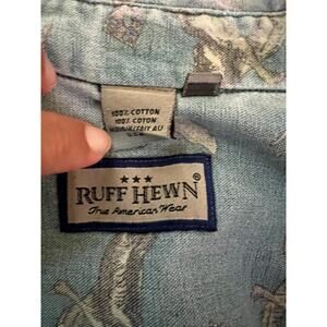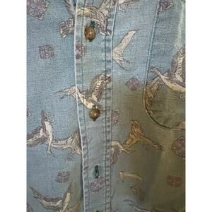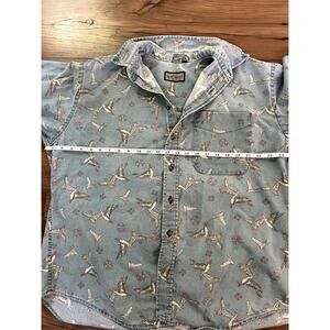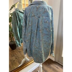 Ruff Hewn Denim Button Up Shirt with all over Bird and geometric Print Sz Large