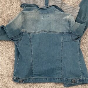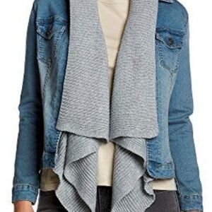 Classic blue denim jacket with a soft gray knit collar. Ideal for casual wear.
