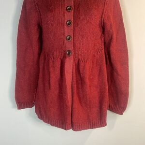 Cozy red cardigan with button-up front. Features ribbed cuffs and hem. Perfect for layering.