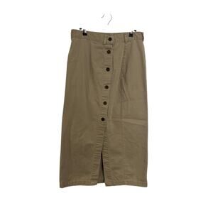 Ruff Hewn skirt in khaki with button front closure, midi length, and vintage styling. Good preowned condition.