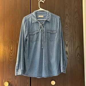 Ruff Hewn blue long sleeved blouse with white polka dots. Tie at the neck which lace up. Two pockets on the front. Size XL.