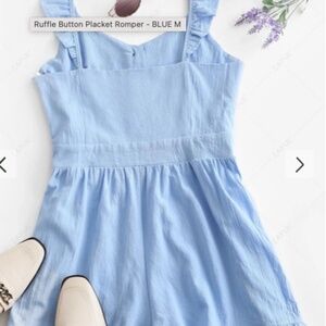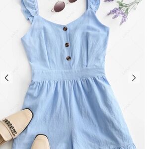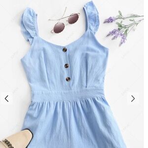 Zaful romper- size medium. Sky blue color. Flutter sleeve detail. Zipper closure. Shorter in length. I typically wear a size small and the medium fit great. So I would def size down. Worn Once!