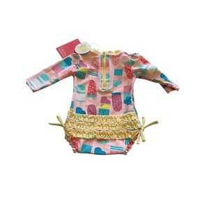 Ruffle Butts Baby Girls UPF 50+ Pink Ice Cream Print Long Sleeve Swimsuit