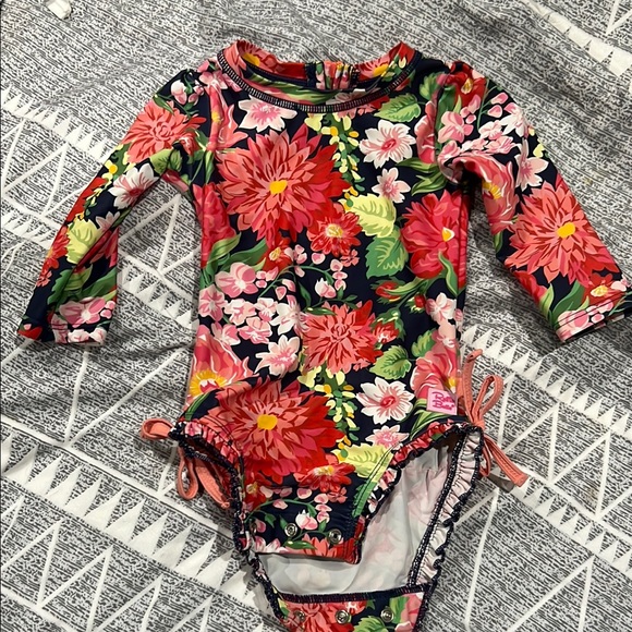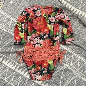 Charming floral swimsuit with vibrant pink and green hues. Features long sleeves for added style.