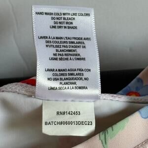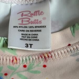 Adorable Ruffle Butts toddler two-piece swimsuit in size 3T. This set includes a long-sleeve floral rash guard with charming front ruffle detail and coordinating blue-and-white striped bottoms with tiered ruffles. Crafted from soft and stretchy nylon-spandex fabric (80% nylon, 20% spandex), it offers both comfort and sun protection for pool days or seaside fun. The bright floral print on pale blush tones makes it perfect for spring and summer wear. Care label indicates hand wash cold and line dry. Gently used condition with no visible wear or fading. Great gift or summer essential.