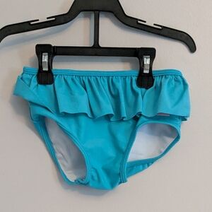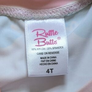 This Ruffle Butts 4T girls’ swimsuit set includes a long sleeve mermaid print rash guard and matching turquoise bottoms with a cute ruffle detail. Made for sun protection and comfort, it’s perfect for pool or beach days. Gently used with slight wear on bum and shirt cuffs.