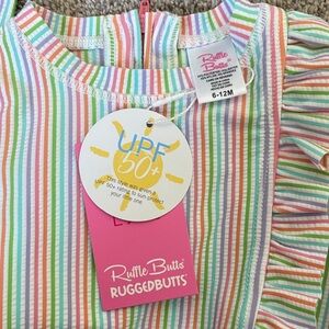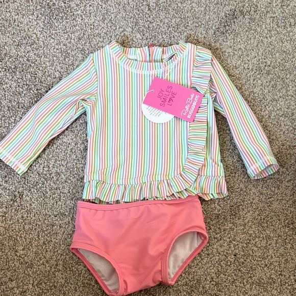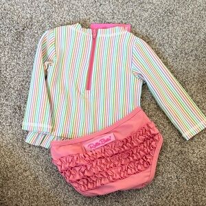 Colorful striped rashguard with ruffle details. Includes matching pink bottoms. Perfect for sunny days.