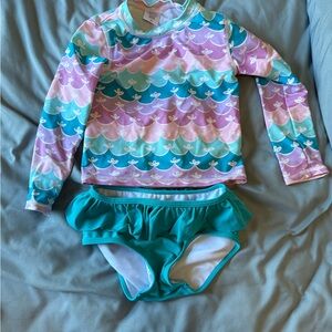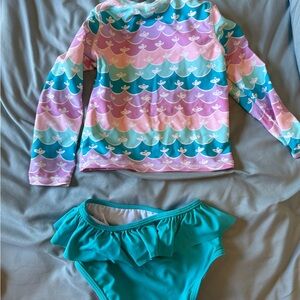 Charming swim set with pastel wave design. Includes long-sleeve rashguard and ruffled bottoms. Ideal for sunny adventures.