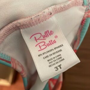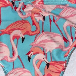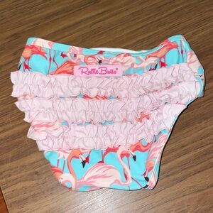 Ruffle Butts Vibrant Flamingo Flounce Bikini Bottom size 3T. Good preowned condition. One small mark on inside near tag. Fun flamingos with pink ruffles on butt area. Pull on. See pictures for approximate measurements. Just have bottoms. Minor wear.