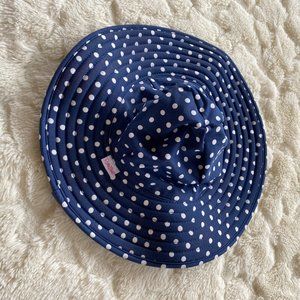 Toddler bathing suit and matching reversible hat. Excellent condition. UPF 50+ sun protection. Navy blue, white polka dots and peach bow/ruffles.