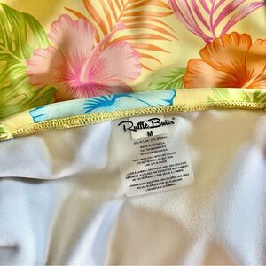 Colorful swimsuit with bold floral pattern. Features pink, orange, and green hibiscus flowers. V neck. Adjustable straps. Tie waist is so flattering. Good bum coverage. Gently pre loved, excellent condition