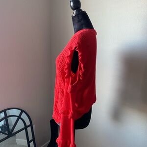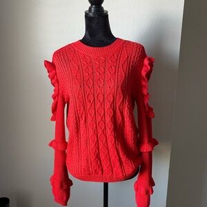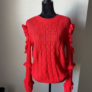 Ruffle Cold Shoulder Cable Knit Sweater