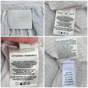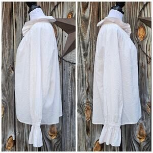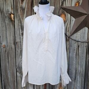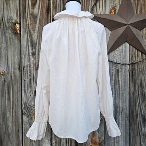 Cotton viscose blend fabric in a light off white ivory color w/ light baby pink pin stripes. Pullover style w/ quarter button placket. Exagerated dramatic ruffled collar can be worn up or down. Long sleeves have ruffle cuffs w/ split & elastic band. Issues noted in photos. Very good preowned condition. Size medium by Citizens of Humanity. Style: Iris Blouse. Colorway: Flora Stripe Ivory.