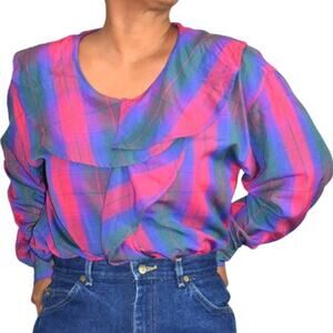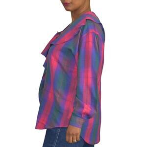 Vintage 90s Sorrel Jrs shirt FEATURES a vibrant bright hued plaid pattern and a ruffle collar. Button front placket with ruffle detail down the front. Long sleeves. Button cuffs. Oversized, loose fit.