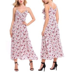 This floral printed chiffon maxi dress is so pretty and feminine! It features ruffles on the faux wrap neckline, adjustable spaghetti straps, and side zipper closure. The soft and breathable chiffon fabric is 100% polyester, but there's no stretch so make sure to check measurements.