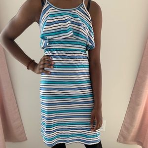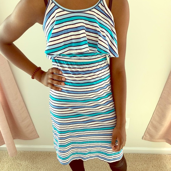 Blue Striped Ruffle Dress Size 10-12 Model is 5’6