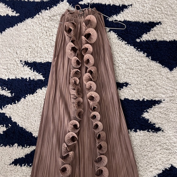 Bought from a designer boutique in Thailand. High quality and color is most accurate in the cover shot. It’s like a dusty pinky. Super flowy and unique