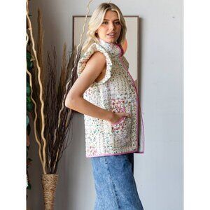 -Quilted pad with a playful printed pattern -Ruffled shoulder details add a touch of fun -Relaxed fit to keep you comfortable -Just throw open the front and go -Imported for your convenience Handwash Cold Model is 5'8" and wearing size Small -Printed quilted pad -Ruffle shoulder -Relaxed fit -Open front vest -Imported Handwash Cold Model is 5'8" and wearing size Small -Stay cozy and stylish in this quilted vest! (Seriously though, is anyone else obsessed with quilted everything?) -Featuring ruffle detailing on the shoulders, this vest adds a touch of femininity to your look. (Who says you can't be warm and chic at the same time?) -The relaxed fit and open front design make this vest comfortable and easy to wear. (Perfect for layering over your favorite sweater on those chilly days.) -Plus, with its imported and high-quality construction, you can trust that this vest will last you for seasons to come. (Who says you can't have fashion AND durability?) -Handwashable for easy maintenance, this vest is perfect for the busy and fabulous woman on-the-go. (Yes, you can have it all.) -Model is 5'