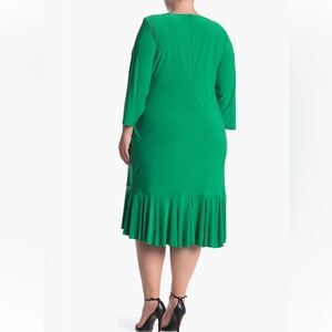 Ruffle Hem Dress. Ruched bodice creates figure flattering look to ruffle hem 3/4 sleeve dress. Features surplice neckline. Fully lined. Length is approximately 43”.