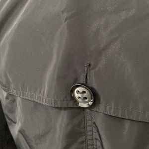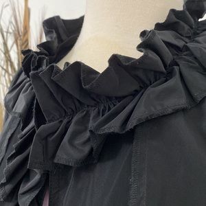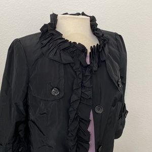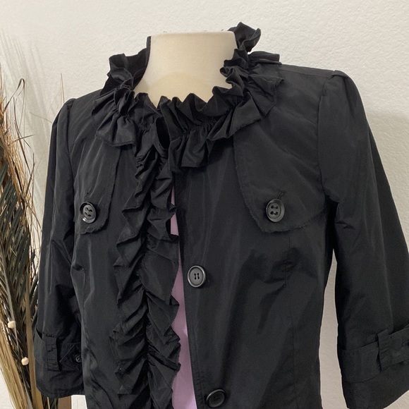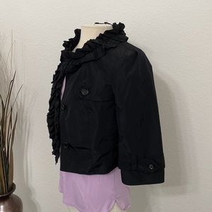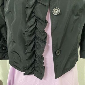 This is a very unique and beautiful jacket. Ruffle detail around the collar and up the front. Three-quarter length sleeves with a crop fit. The fabric is like a rain jacket material.
