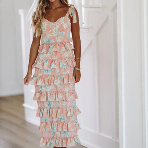 Floral maxi has the cutest layers of ruffles and tie straps. Beautiful colors. Brand new with tags. I am 5'7 and the dress is a few inches above my ankle. Love this dress but found another for my gender reveal that I like better.