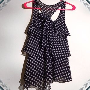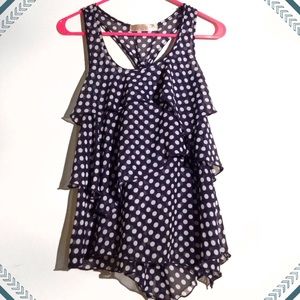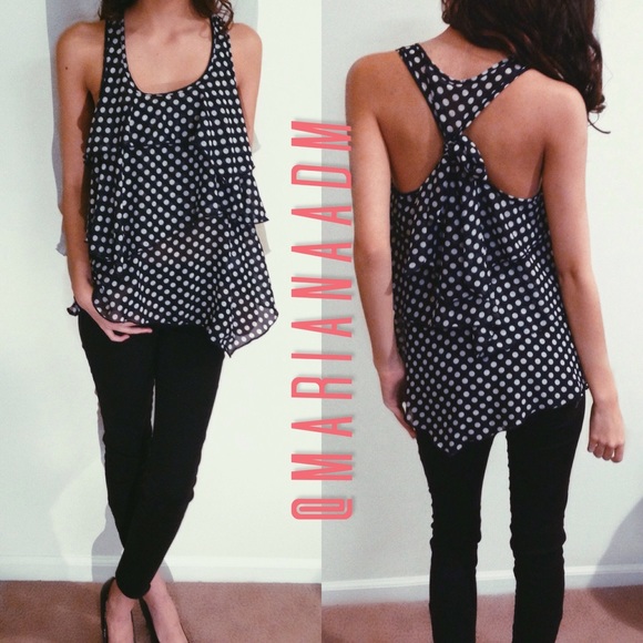 A really pretty polka dots racerback top with ruffles. You can dress it down with a pair of jeans and boots or you can dress it up with some pumps and a blazer.💁🏻 I wore it once so it's in pretty good condition, no holes or stains. Leave a comment if you have any questions😊