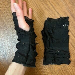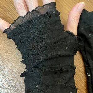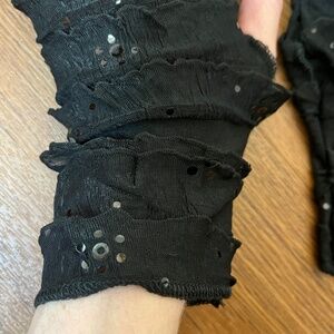 Short black ruffle fingerless gloves with flat "sequins". Great for cosplays, mummy halloween costumes and gothic/alternative outfits! I also make these in more colors and patterns!