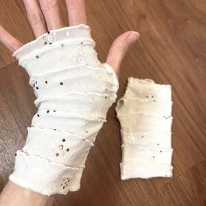 Short white ruffle fingerless gloves with silver flat "sequins". Great for cosplays, mummy halloween costumes and gothic/alternative outfits! I also make these in more lengths, colors and patterns!