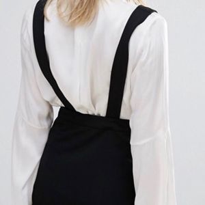Black skirt with ruffle accent on the front and zipper on the side. Can be worn with or without the suspenders. Made by Mango. The skirt says it's a size 8 but ti fits like a 10. I actually purchased it as an 8 to wear and it' doesn't fit and I'm really disappointed because it's so cute. This item had never been worn. (I did try it on, but that's all)