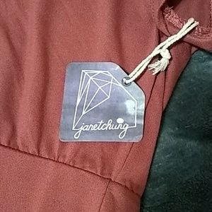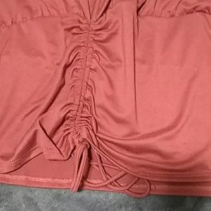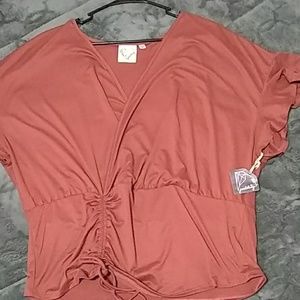 NWT. Never worn. The color is more like a burnt orange or cinnamon brown. This blouse is ultra sexy. Has ruffles on short sleeves. Ruching on blouse. Can be layered with a Cami underneath and can also add a brooch to add more coverage on "the girls" . 22 inches in length..smoke free and pet free home.