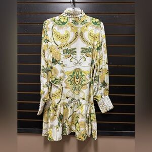 Elegant floral print dress featuring vibrant green and yellow hues. Perfect for any occasion with its stylish design and comfortable fit.