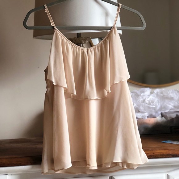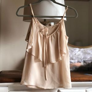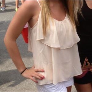 Ruffle tank in an ivory color. Ties in the back. Fully lined so is not see through. 100% polyester.