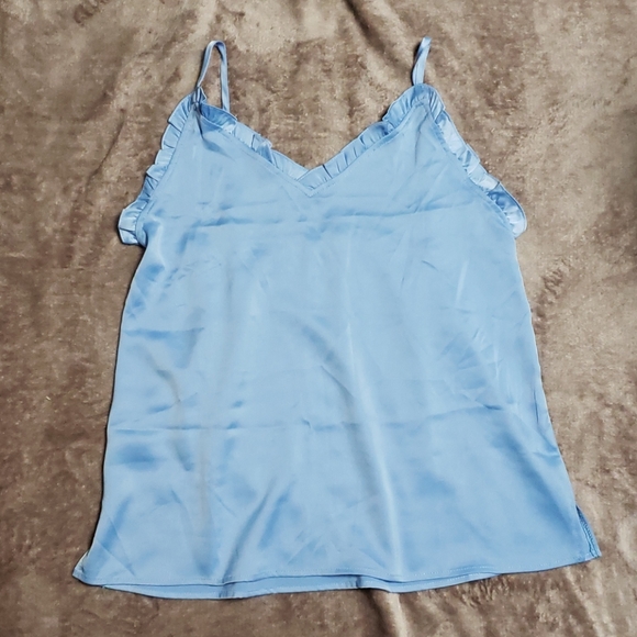 Powder blue ruffle edge tank top. Silky, chiffon type material size large. Very pretty alone or under a blazer or cardigan. Only worn once.