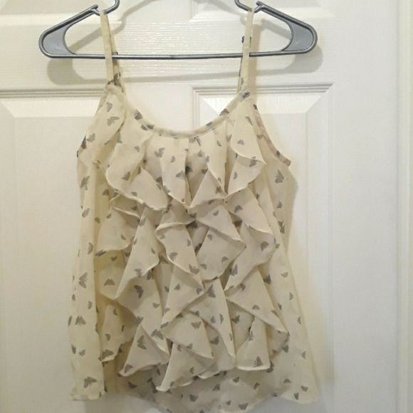 Adjustable ruffle top with spaghetti straps. Great condition. This is more like an off white, cream color.