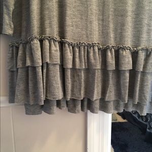 Long sleeved ruffle tunic boutique shirt. Looks great plain or with a scarf! Worn twice, does have small mustard stain on the bottom (as shown in picture) Very cute with leggings or jeans!!