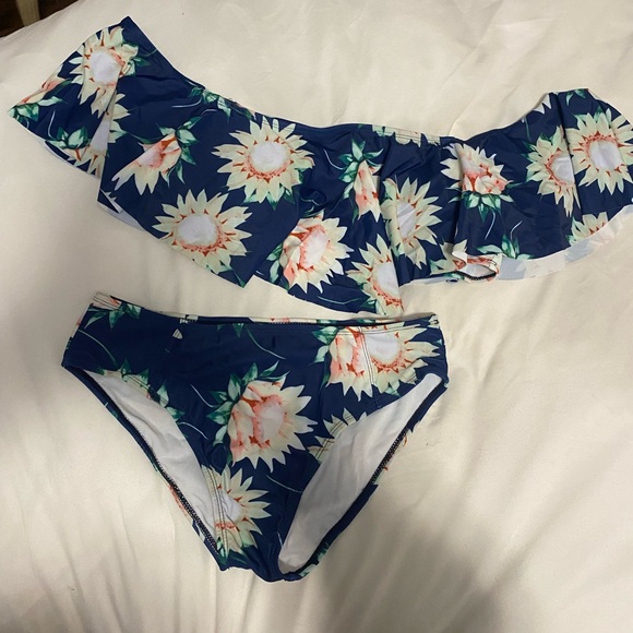 Ruffle sunflower bathing suit. Has pads and arm holes. Size XL but fits more like a large. High waisted bottoms. No brand.