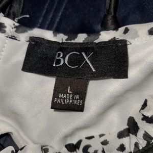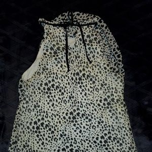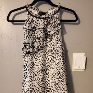 Cute sleeveless black and white ruffled blouse. Ties around neck and flowy at the bottom.